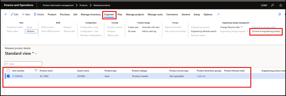 - Select the product and click on the “Convert to Engineering product” under Engineer Tab