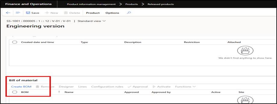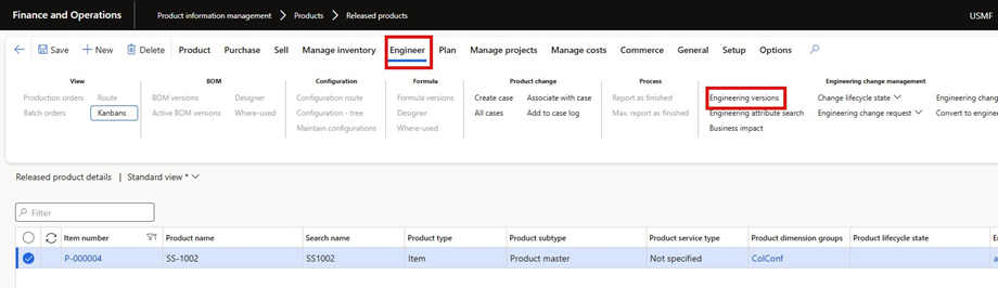 - Open the product details: – Select the product form the list, open the product record to access the engineer tab and ensure the engineering version exists.