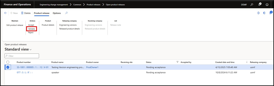 - Validate the Product: – Click on the Validate button to ensure that the new release product have all the required information before provide acceptance.