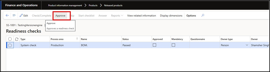 - Readiness Check :- Click on the Readiness check to ensure that all the required information and setup are available under item before it will available for user transactions. Approve the readiness check and after this item is ready for use.