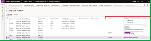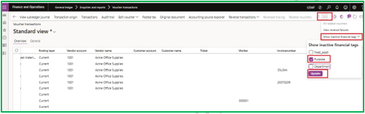Now in my use case, somehow, we decided to discontinue the existing financial tag, and wanted to deactivate that tag “Purpose”. But later we found some requirement to have that data which was posted in the deactivated tag values without activating that financial tag. So, in that case, what we can do is, we will click on voucher transactions and on top right of that we will click on three dots and will click on show inactive financial tags. By doing this you can easily find that old tag values in your posted transactions.
