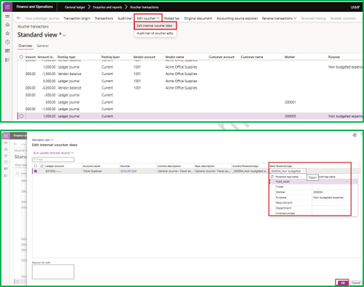 If you found that you have entered wrong financial tag or want to change the financial tag on posted transaction, click on edit voucher in voucher transactions page and edit internal voucher data. Here you can select the desired values that you want to use on posted transactions.