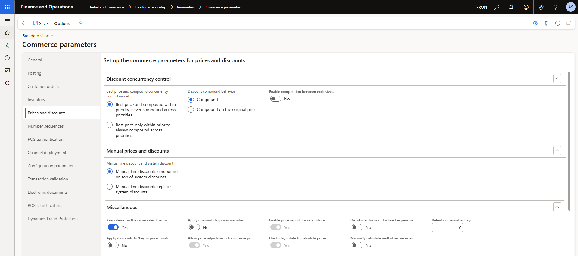 - Discount concurrency mode – This determines which discounts compete on a transaction, and which discounts are compounded together. The three values for this option are Exclusive, Best price, and Compound.