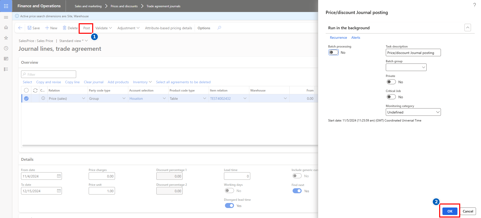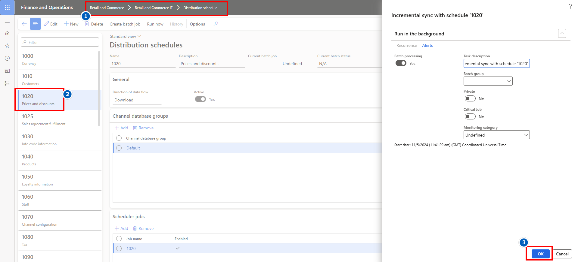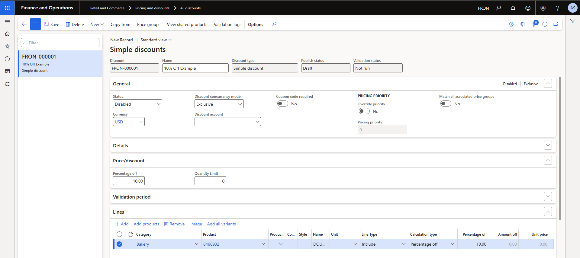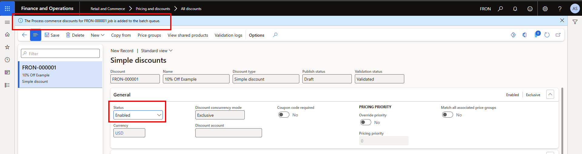 - Finally, enable the discount to apply the price to the stores. Just like trade agreements, the 1020 Prices and discounts distribution jobs needs to be run; this happens automatically when the discount is enabled.