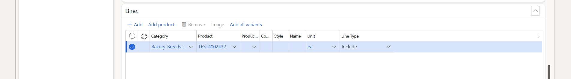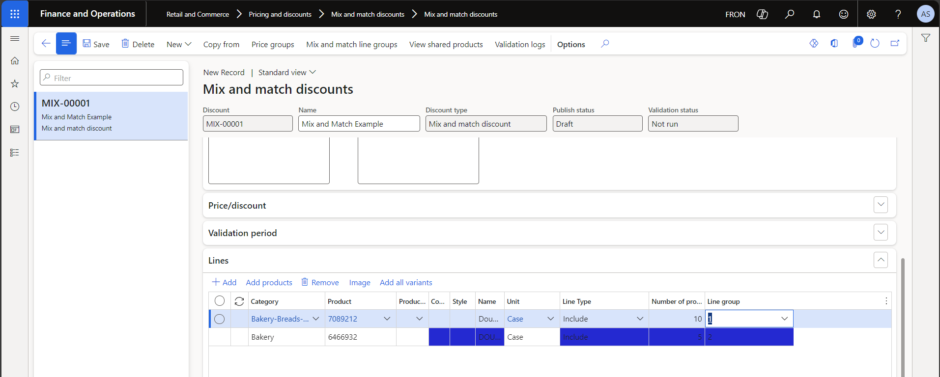 The ‘Mix and match line groups’ set what groups of items must be purchased. For this bread promotion, you must buy 10 of the yeast rolls and 5 of the bagel dough to get 1 bagel dough free.