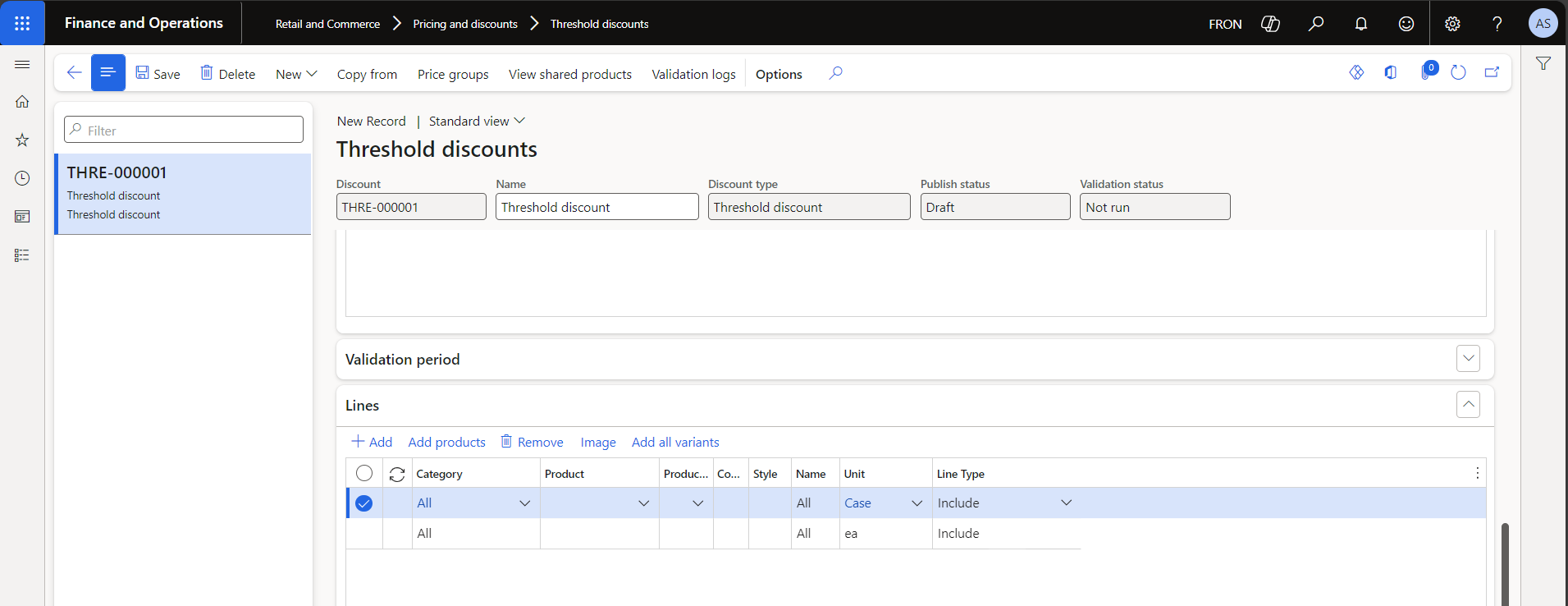 Threshold discount example: options are Amount off, Percentage off, or Line specific discount.