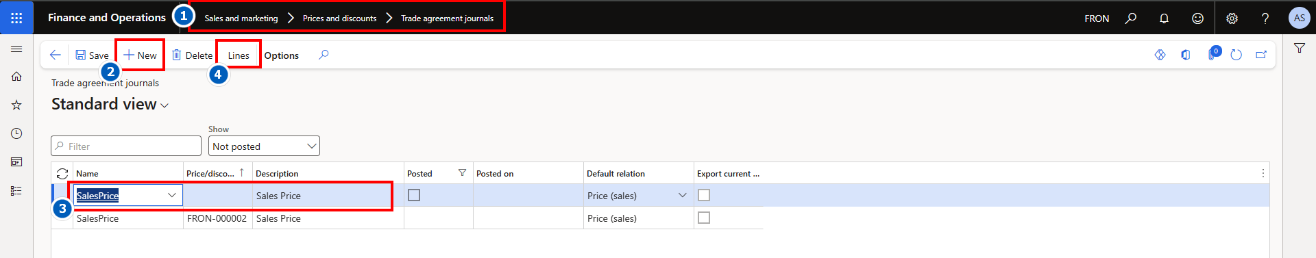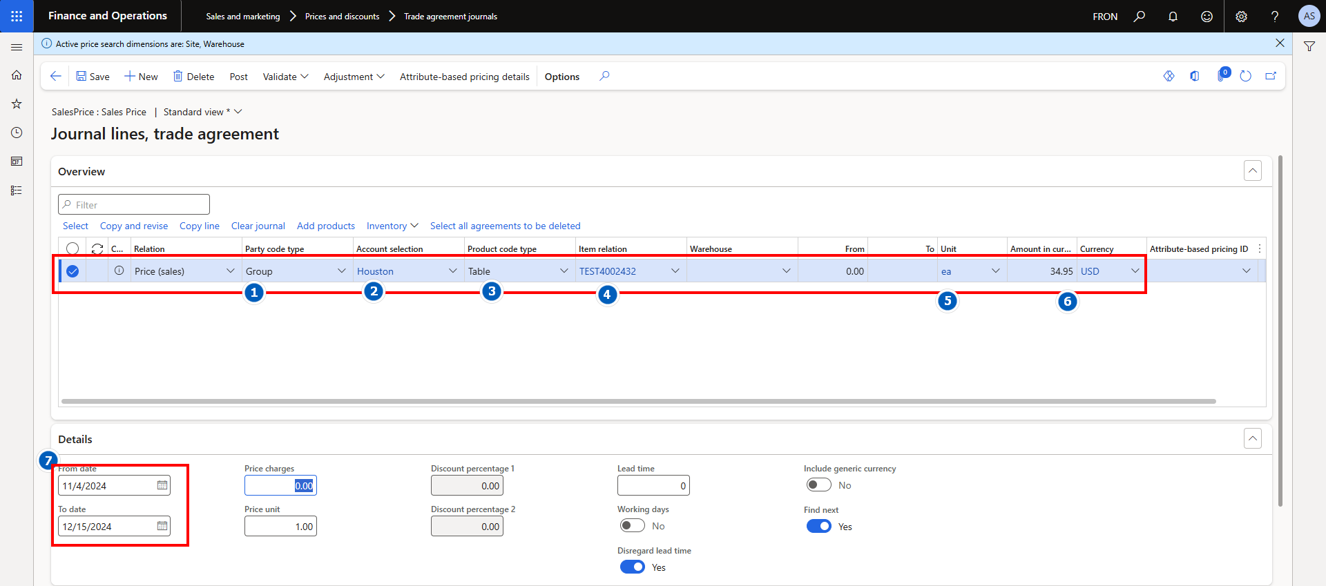 A Trade Agreement represents a user-defined price for an item at a specific site or location. A trade agreement is set up as noted below. First, enter the header as shown, then click Lines