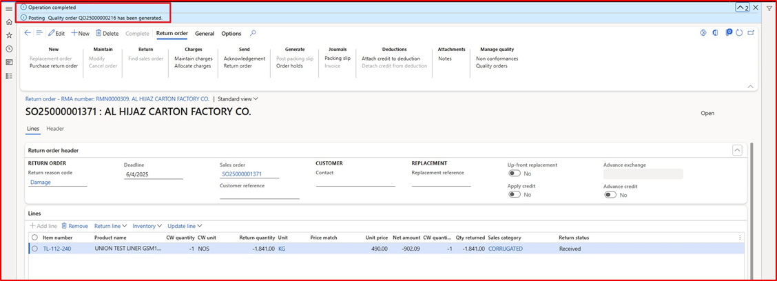 A paper manufacturing company, “Evergreen Paper Mills,” uses D365 Finance and Operations “Evergreen Paper Mills” has sold a large Paper Reels to a printing company. The customer reports that a portion of the delivery has issues with damage and Creasing. Evergreen Paper Mills initiates a sales return process with quality inspection.