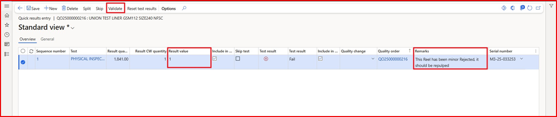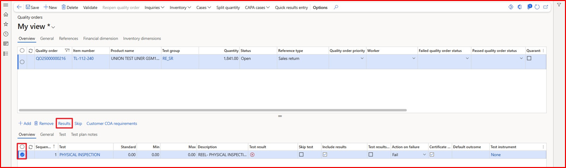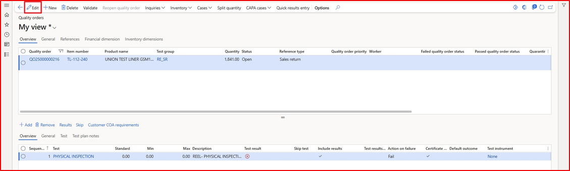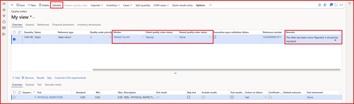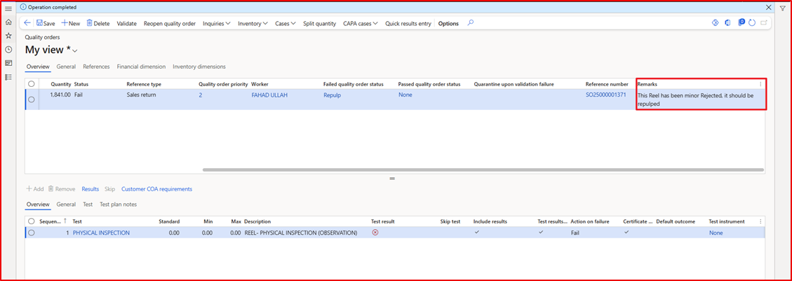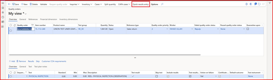 *Important NOTE: The system automatically generated Quality Order QO25000000216, as shown in the screenshot below.